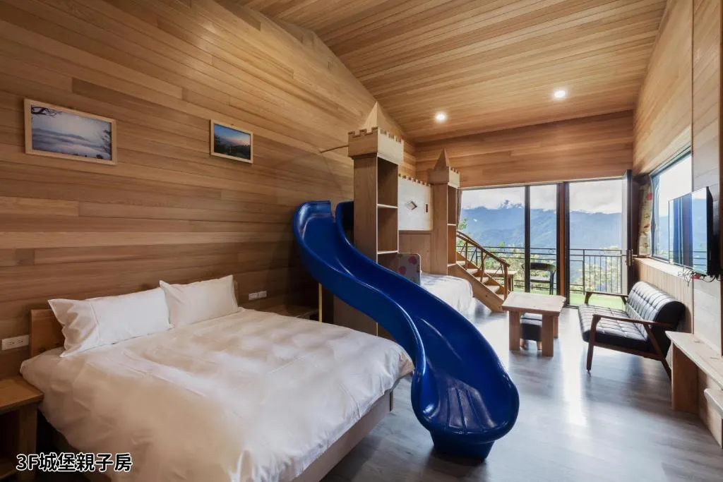 房間空間寬大,木質香氣濃厚,陽台可遠眺壯麗山景與夕陽,夜晚更能欣賞滿天星斗,帶來放鬆療癒的住宿體驗。