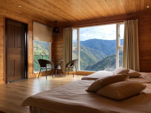房間設有大面積透明玻璃窗,讓旅客能一邊躺在舒適的床上,一邊欣賞拉拉山櫻花季、雲海與日出美景,營造出放鬆且療癒的住宿體驗。